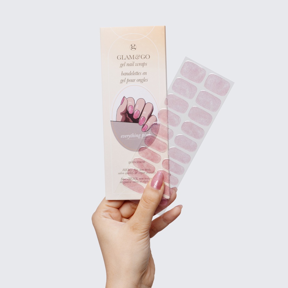 Our GLAM & GO gel nail wraps ensure that no matter how complex your chosen nail design, the application process remains incredibly simple. Our GLAM & GO gel nail wraps require no glue, base coat, or top coat—just peel them off the packaging, apply them to your nail, trim to size, cure twice, and voilà!